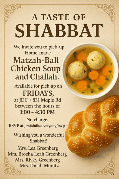 Weekly distribution of homemade Challah and chicken soup